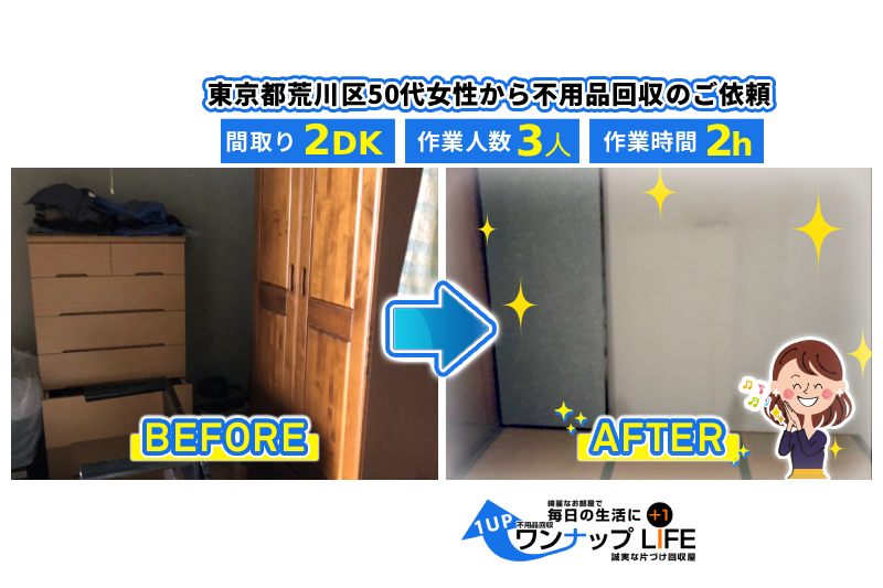 退去日が迫る中、長年住み続けたお部屋の片付けが進まずお困りではありませんか? 今回は、東京都荒川区にお住まいの50代女性のお客様より、退去に伴う家財一式の回収をご依頼いただきました。